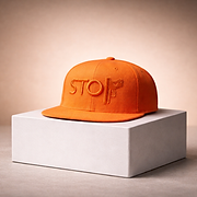 The symbol on the hat is intentional. You see a gun and your mind fills in the rest. Then you see STOP®. Then you see the gun turned upside down and backward, unable to function. The assumption breaks. The action stops. The moment shifts.